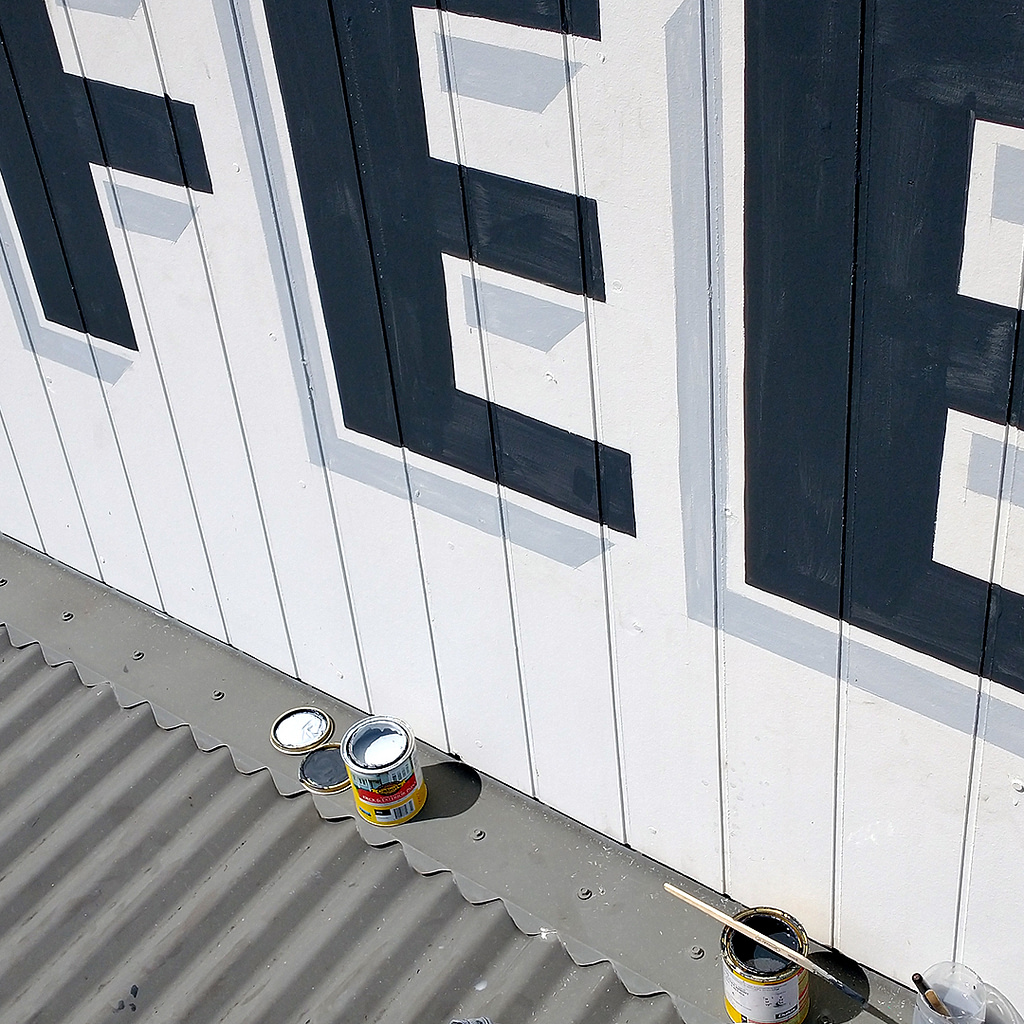 Painted signs are a great option when there is a difficult surface to consider that will not accept vinyl. This corrugated facade receives full sun and UV all year round so I used a high quality exterior acrylic paint which will last 10 years minimum. Unlike vinyl, painted signs develop a pleasing patina with age, create minimal waste and can be easily painted over if needed.