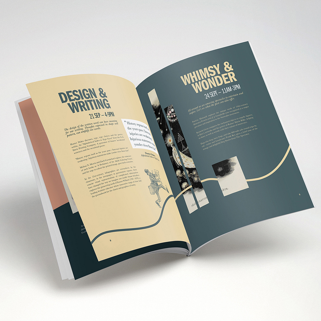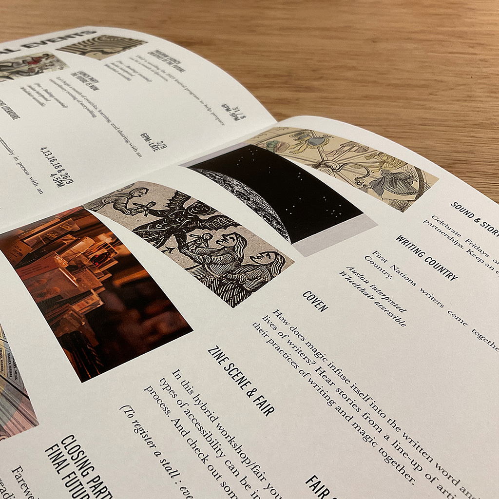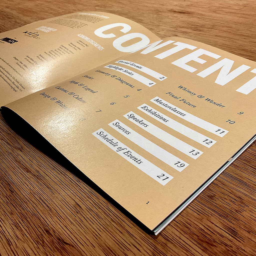 Traffic Festival required a printed booklet for their upcoming event. The festival focuses on re-imagining public domain essays, articles and images – exploring the world of the past through art, design and culture. After some consultation we agreed on a custom-sized 28 page saddle-stitched booklet on 150gsm coated gloss paper.